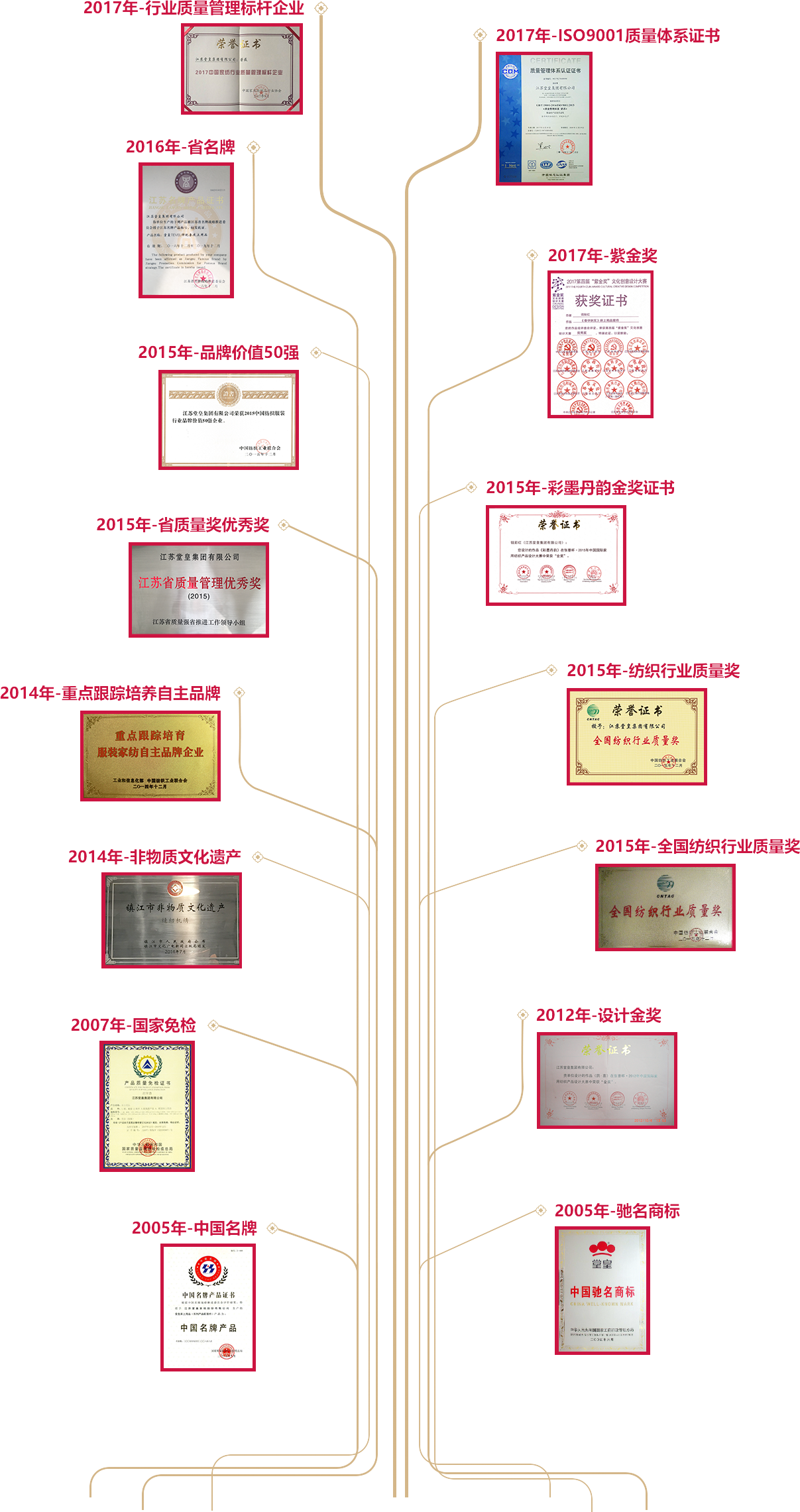 作為中國家用紡織品行業協會副會長單位, 憑借深厚的工藝技術積累,國際一流的產品設計和嚴格的企業管理,堂皇榮膺“江蘇省重點培育和發展國際知名品牌”、“江蘇省質量管理獎"等多項榮譽,并且參與多項國家行業標準的起草。2012年,被列為"全國重點跟蹤培育的服裝家紡自主品牌企業"和“國家級高新技術企業”。